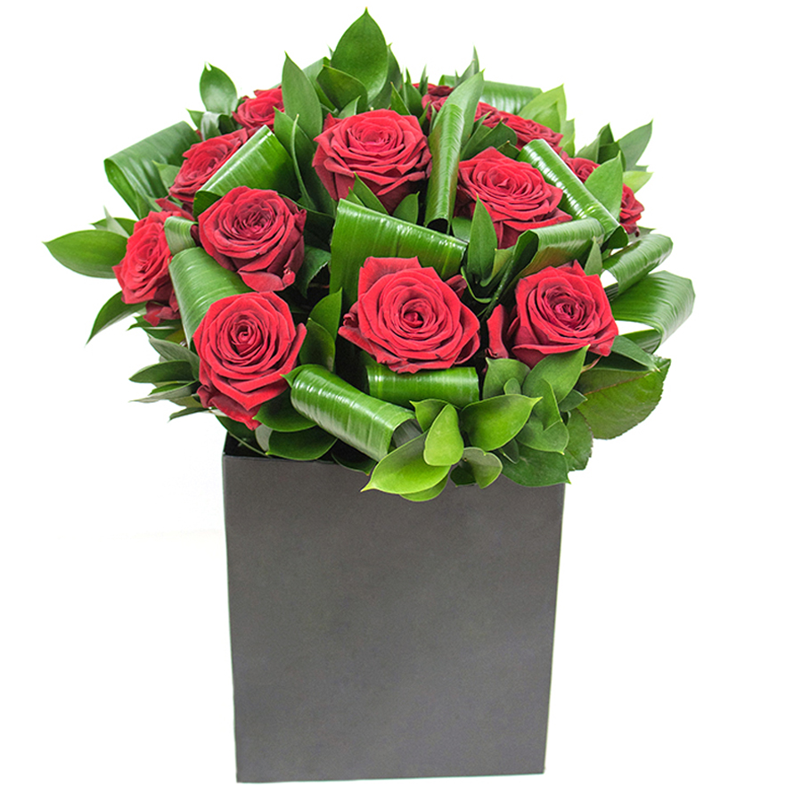 Illuminate your home with our unique and stunning bouquet featuring vibrant red roses, lush aspidistra leaves, and elegant ruscus. This beautiful design adds sophistication and charm to any space.